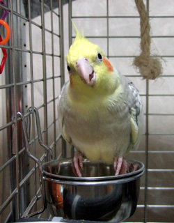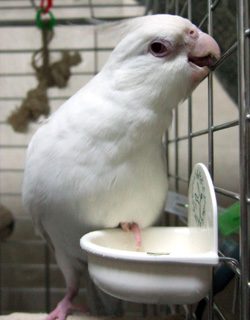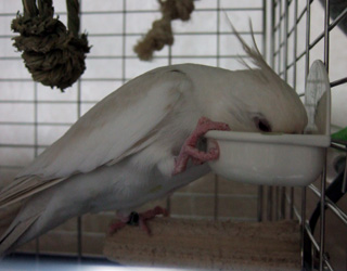 エサ入れに足を掛けて、好きなように食べてご機嫌